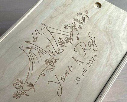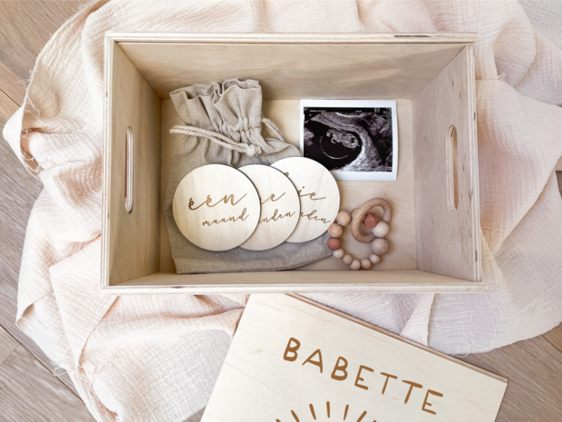 Het deksel wordt gepersonaliseerd met ontwerp op maat, waardoor de doos niet alleen functioneel is, maar ook een waardevol en persoonlijk aandenken vormt.