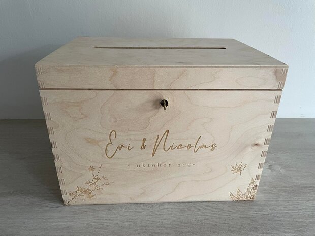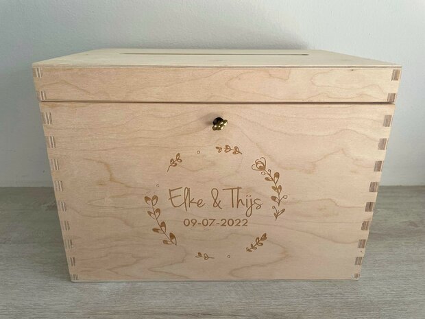Deze houten enveloppenkist is de perfecte oplossing om op een stijlvolle manier kaartjes en enveloppen te verzamelen tijdens een huwelijk, communie, babyborrel of verjaardagsfeest. De kist is gemaakt van stevig hout en heeft een sleuf bovenaan om de kaartjes makkelijk in te schuiven.